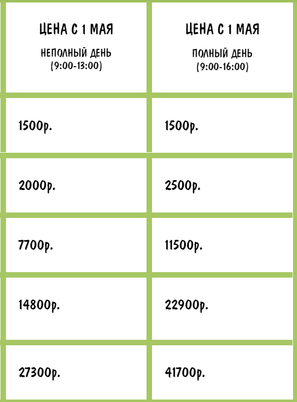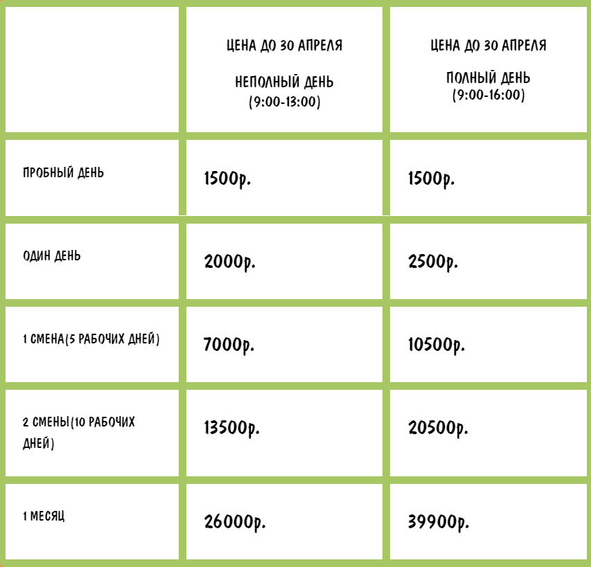 *При покупке абонемента в летний клуб на 4 недели, дарим скидку 50% на все другие абонементы и мастер-классы **Абонемент в летний клуб на 2 недели предоставляет скидку 30% на все другие абонементы и мастер-классы (исключая сад и индивидуальные абонементы).
